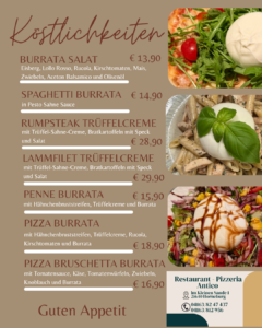 Vorspeisen, Risotto, Suppen, Salate, Aufläufe, Calzone, Pasta, Kinder gerichte.